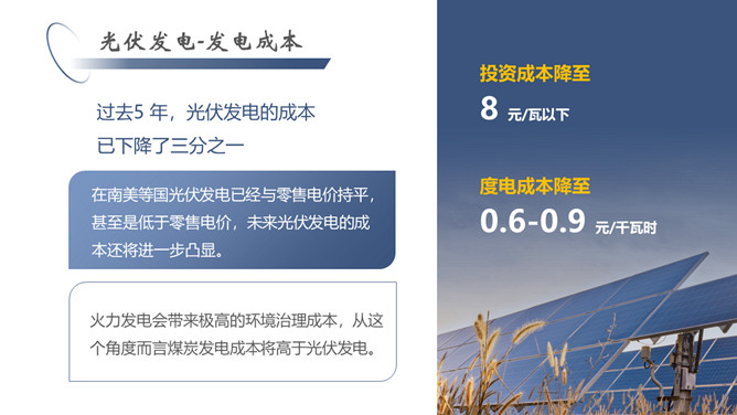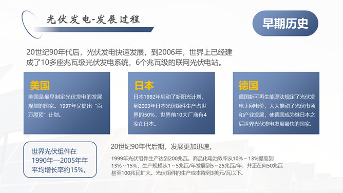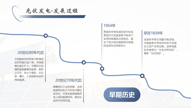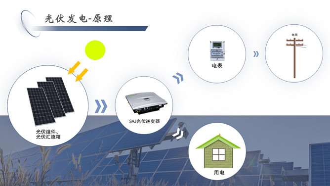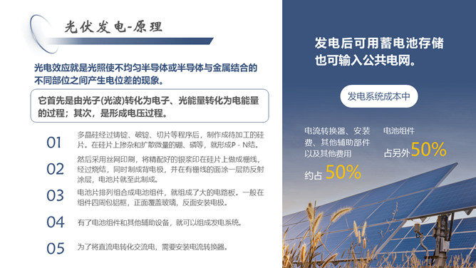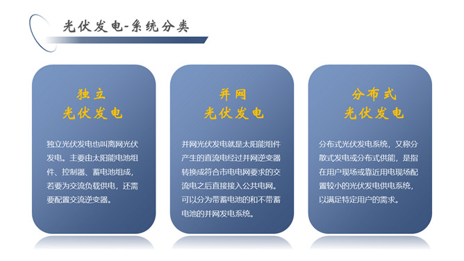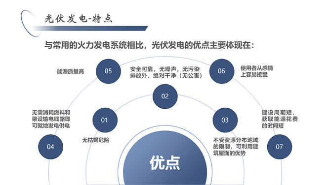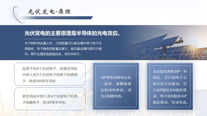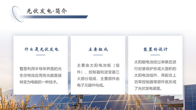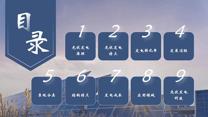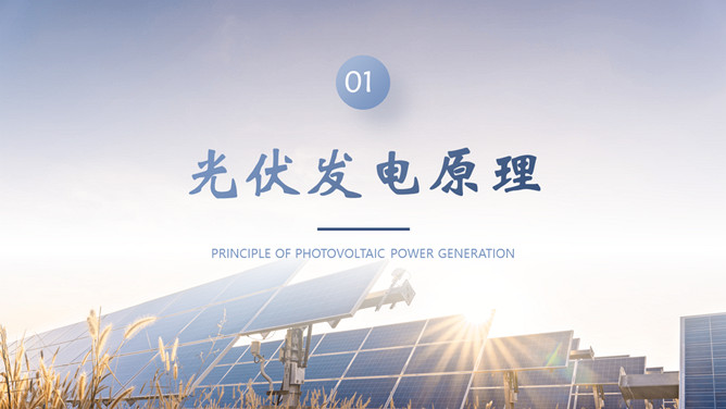 太阳能光伏发电PPT模板。一套光伏行业幻灯片模板,光伏发电原理和特点、发电转化率、发展过程、系统分类、结构特点等内容。