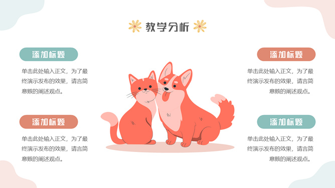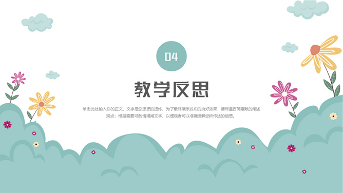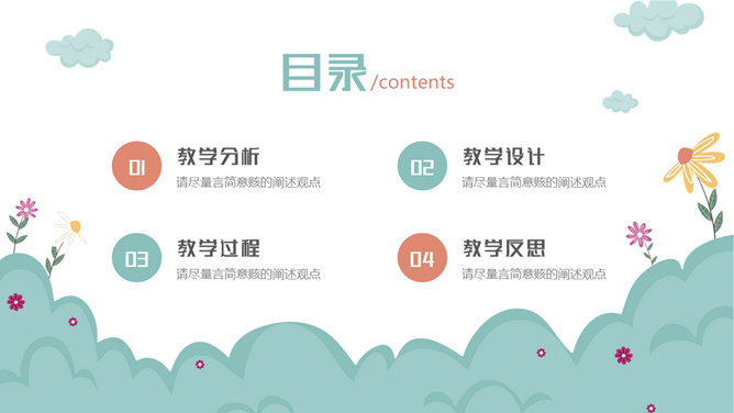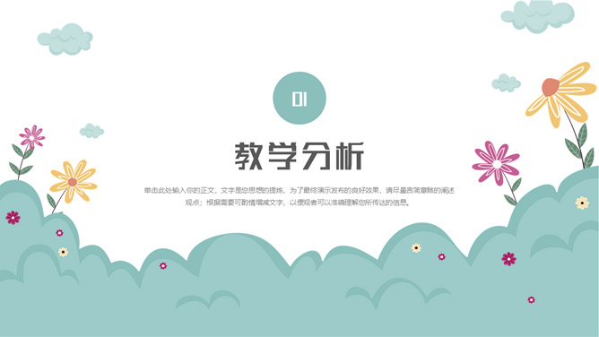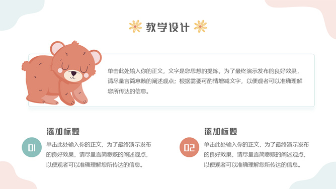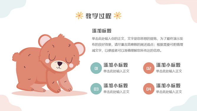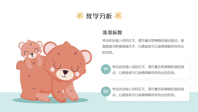 可爱卡通幼儿园说课PPT模板。一套卡通风格幻灯片模板,可爱小熊、狐狸等动物元素装饰,适合幼儿园教师说课等。