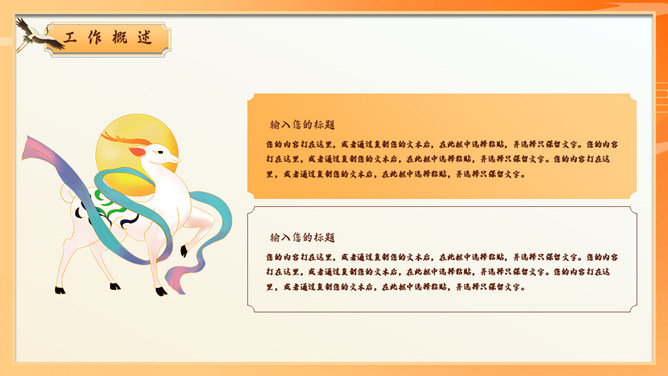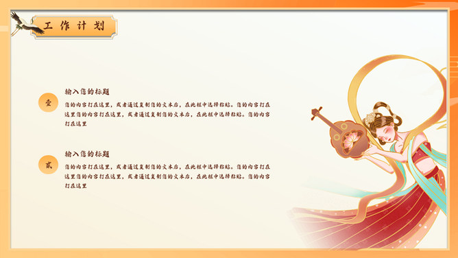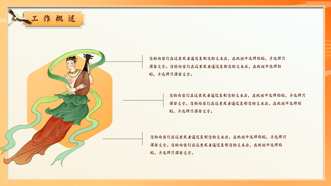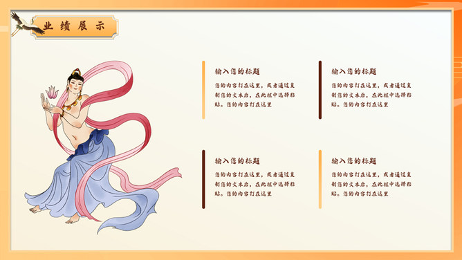 敦煌仙女飞天国潮风PPT模板。一套国潮中国风幻灯片模板,飞天仙女主题元素设计,橙黄色主色调,动态播放。