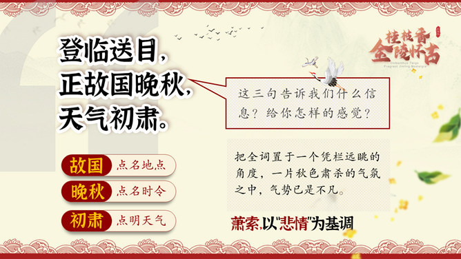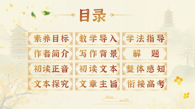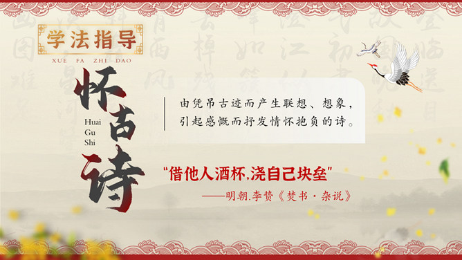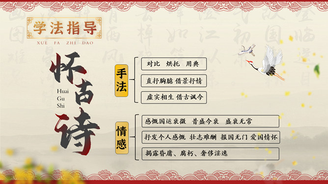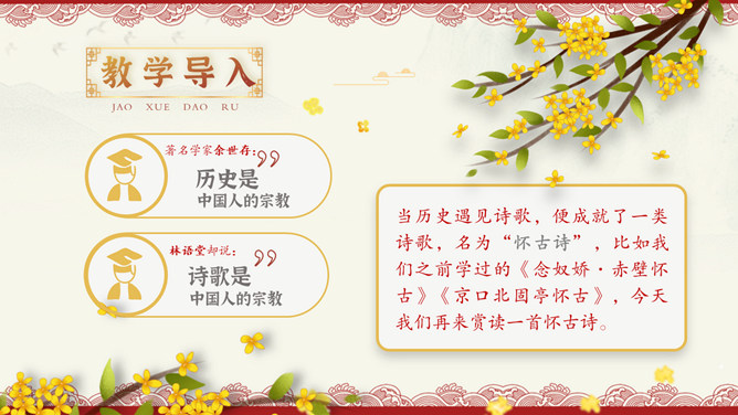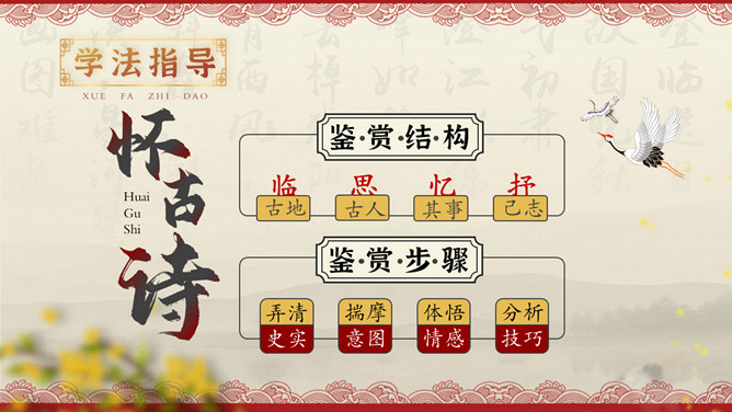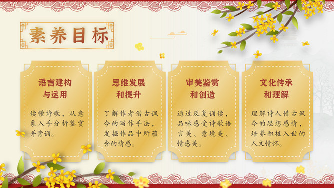 读懂诗歌,从意象入手分析鉴赏并背诵。了解作者借古讽今的写作手法,发掘作品中所蕴含的情感。通过反复诵读,品味感受诗歌语言美、意境美、情感美。理解诗人借古讽今的思想感情,培养积极入世的人文情怀。