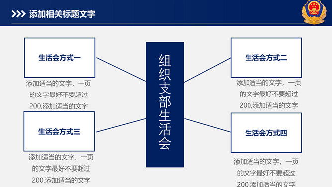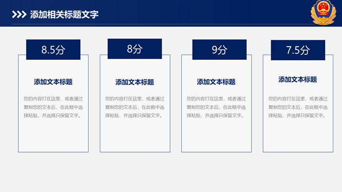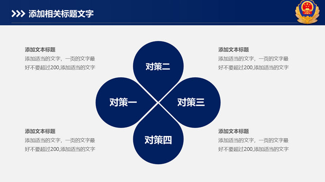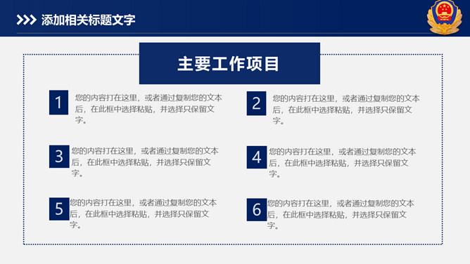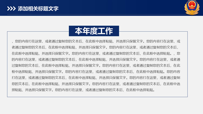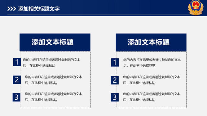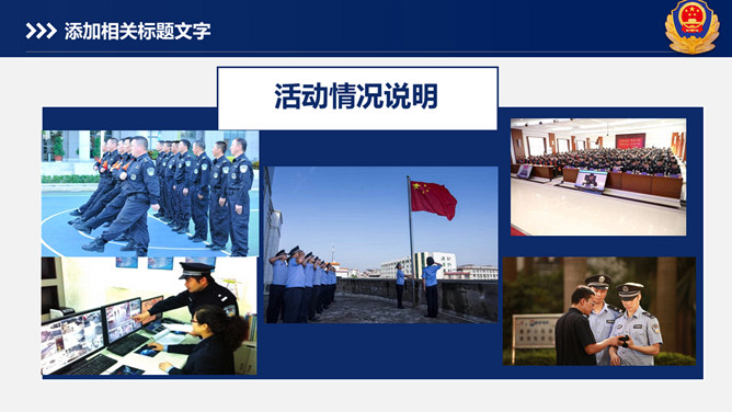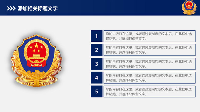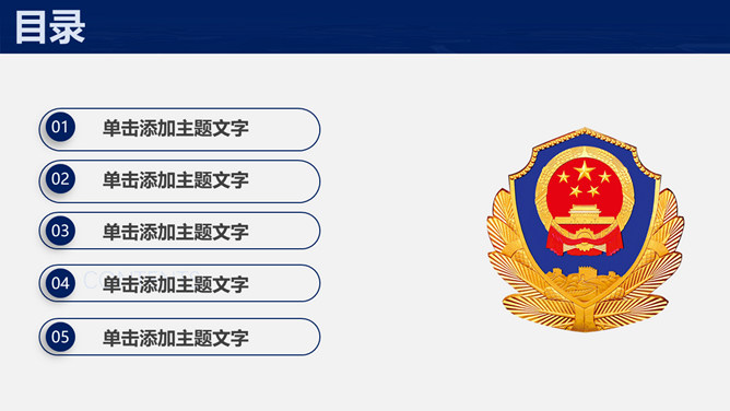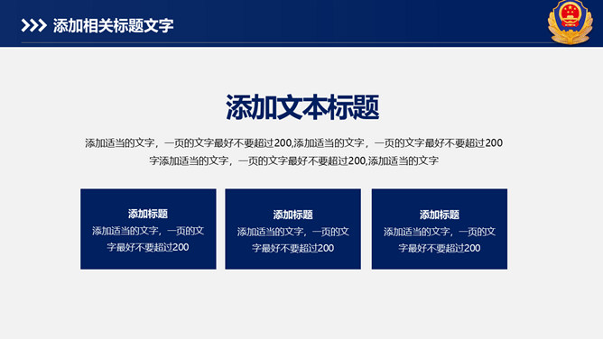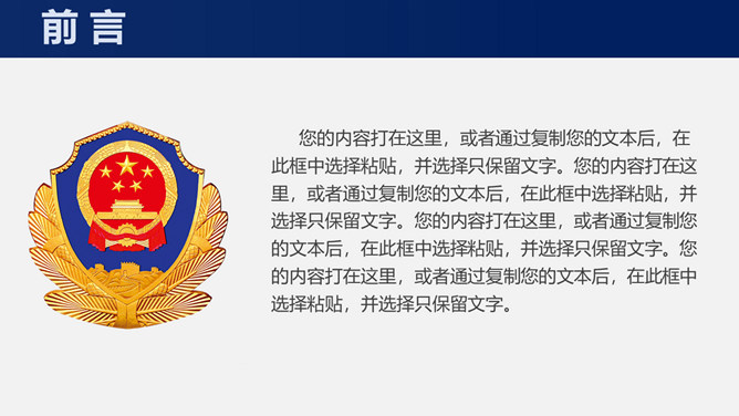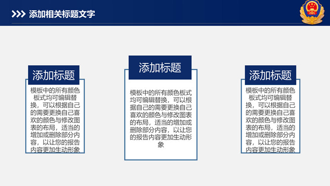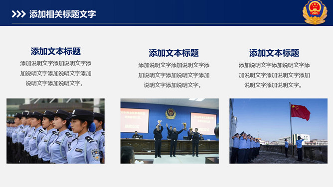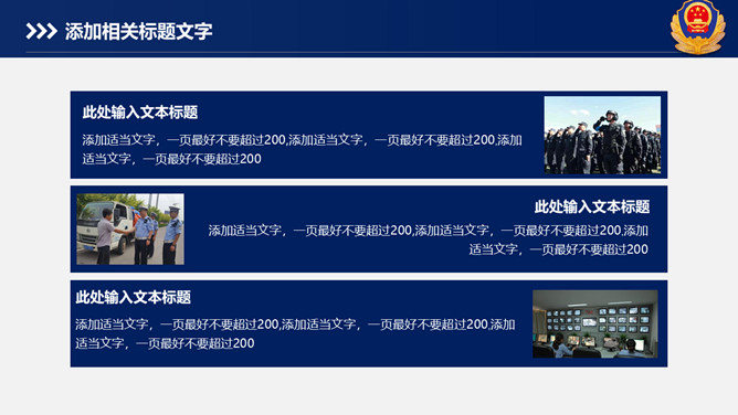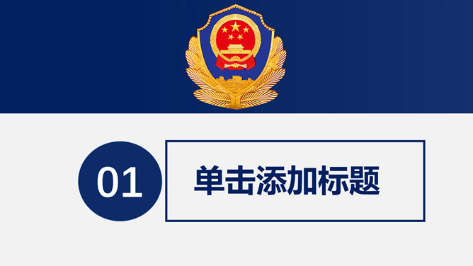 公安警察派出所城管执法PPT模板。一套公安警察主题模板,蓝灰配色,深蓝主色调,警徽素材装饰。