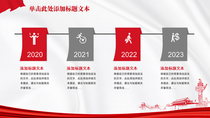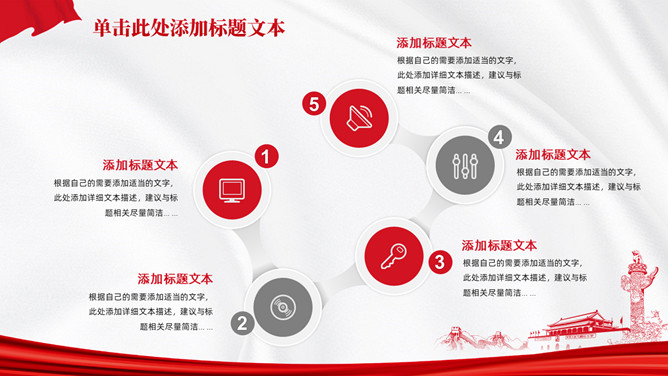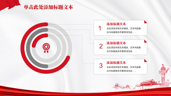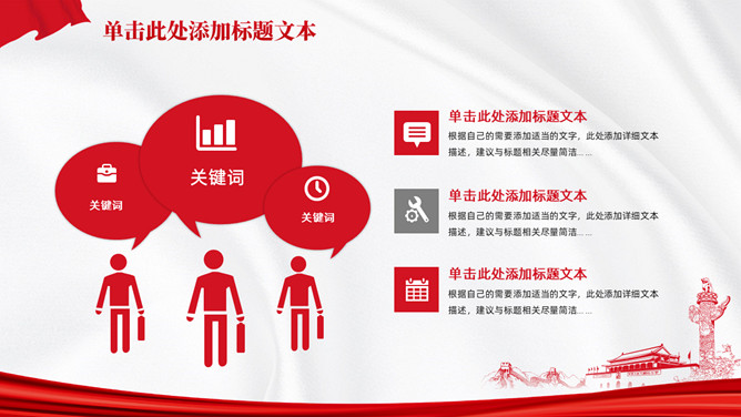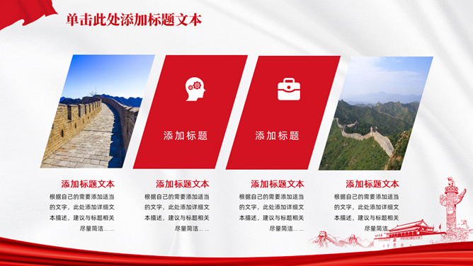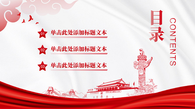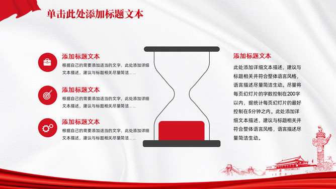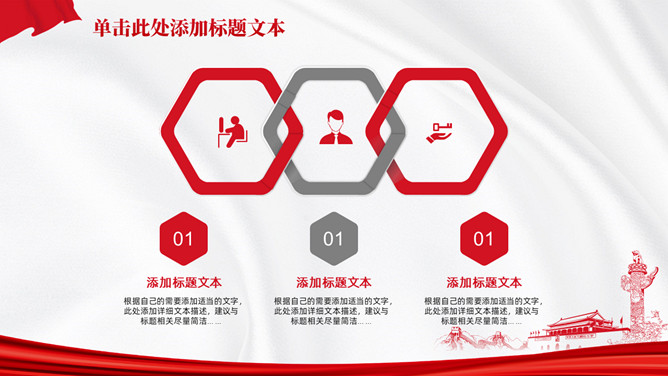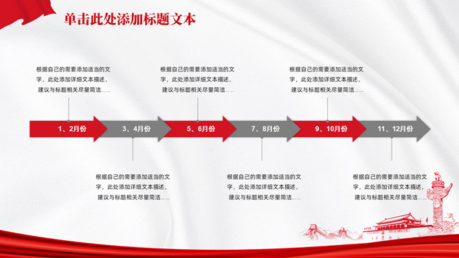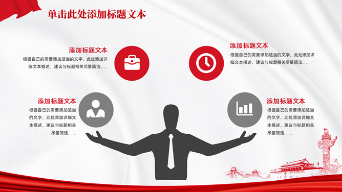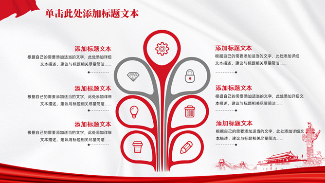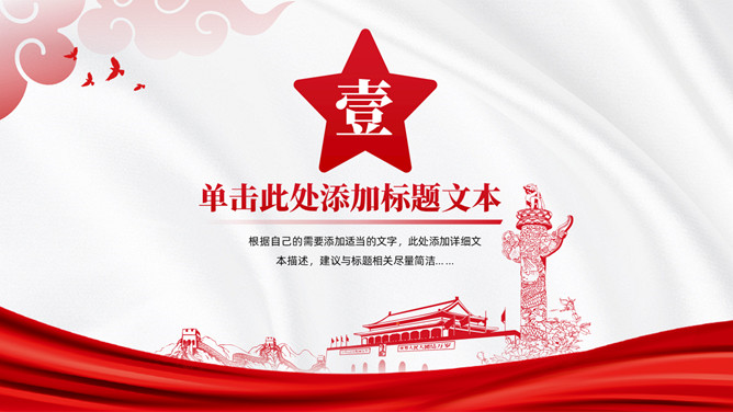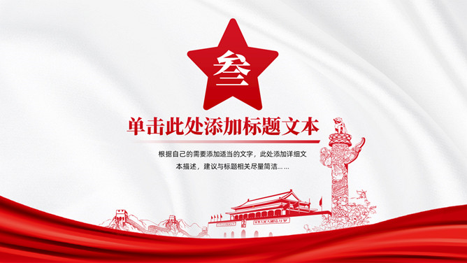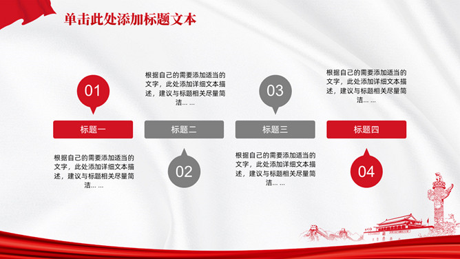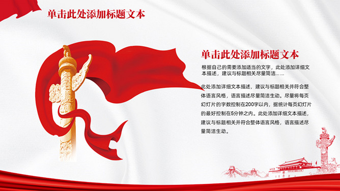 党政党建工作总结PPT模板。一套党政主题幻灯片模板,大气红色主色调,天安门、华表背景,适合党建工作汇报。