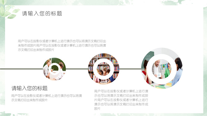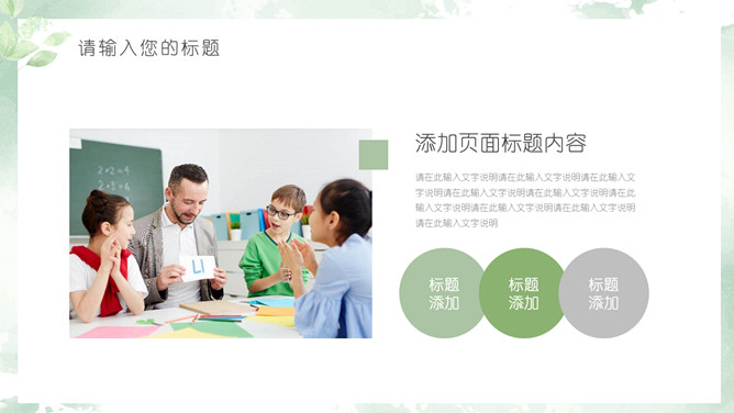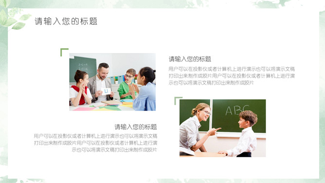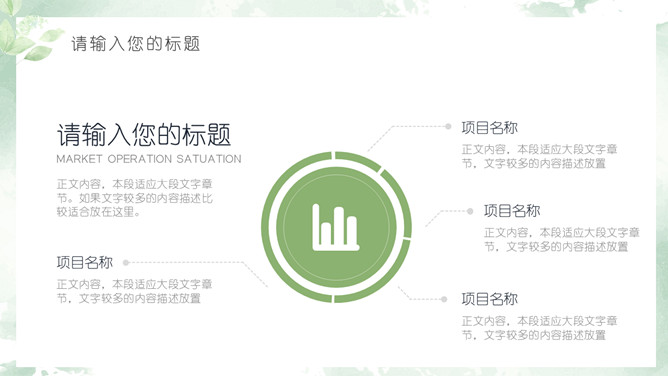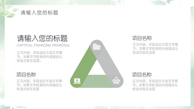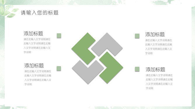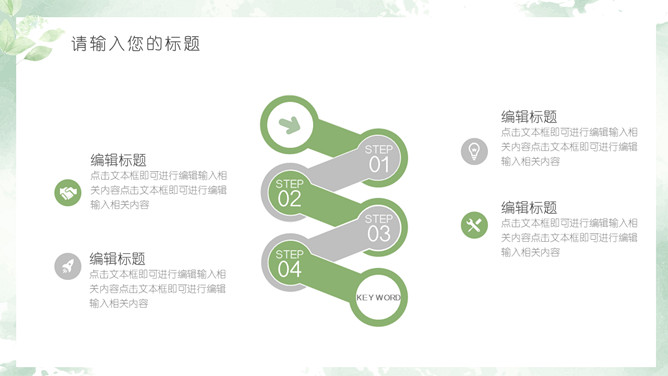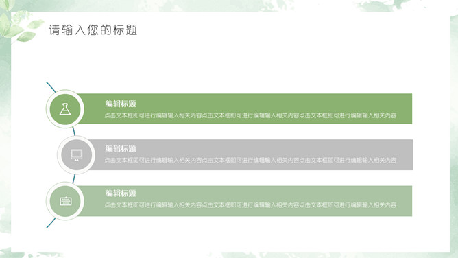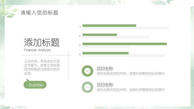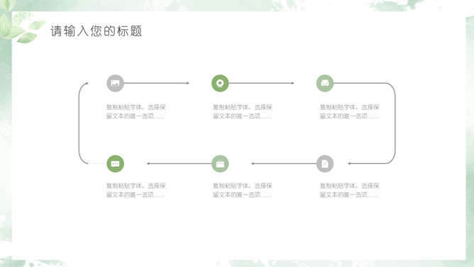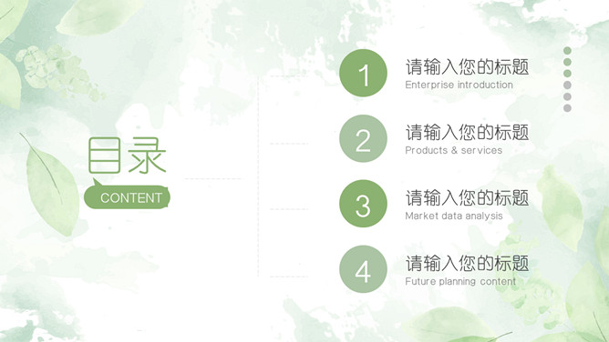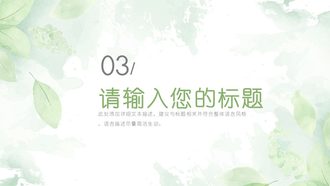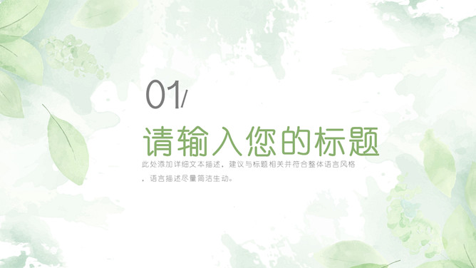 淡雅绿色水彩叶子PPT模板。一套淡雅通用幻灯片模板,绿色水彩叶子背景,清新淡雅,适合工作汇报等用途。