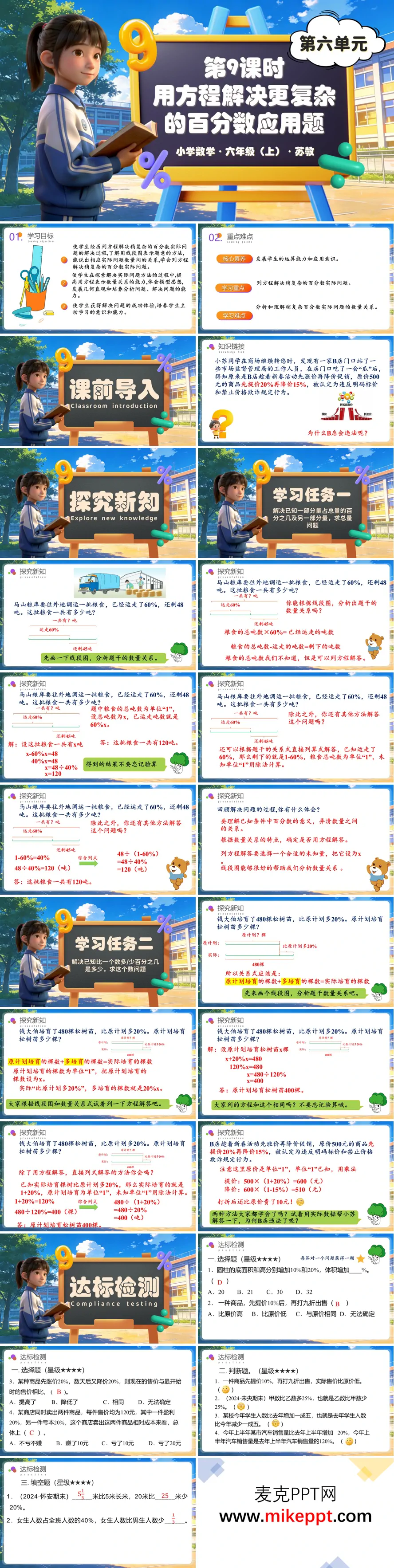 这份六年级上册第9课时课件聚焦“用方程解决更复杂的百分数应用题”,以“B店先涨价再降价”的价格套路切入:同款运动鞋先涨20%再降20%,现价是否等于原价?学生直觉猜测后,教师用线段图动态演示“涨-降”过程,发现现价低于原价,生活悬念瞬间激活列方程需求。 探究任务一围绕“已知一部分量占总量的百分之几及另一部分量,求总量”展开:粮食基地调运小麦,已运出62%,剩余76吨,求总量。教师引导学生画双线段图,把“总量×(1-62%)=剩余”的隐蔽关系可视化,再呈现方程法:设总量为x,(1-0.62)x=76,解得x=200;对比算术法76÷(1-62%),学生发现“方程顺着想、算术倒着推”两种思路,突出方程顺向优势。 任务二升级“已知比总量多(少)百分之几是多少,求总量”:松树苗比原计划多20%,实际培育360棵,求原计划。线段图把“原计划×(1+20%)=实际”呈现为“原线段+增长段”,学生列方程(1+0.2)x=360,解得x=300,再回代验算,强调“增长百分之几=1+百分率”的模型。 为突破“理解复杂数量关系”难点,课件设计三道梯度练习:体积变化“冰化水减少10%”、价格涨跌“先降再涨”、盈亏计算“成本与售价”,题型含选择、判断、填空,系统实时统计正确率,教师针对“单位1找错”“百分率加减混淆”再示范,确保模型落地。 总结用“一张思维导图”收束:画线段→找等量→列方程→回头看;自我评价从“我会画图、我懂等量、我肯验算”三面点赞,小组互评贴星星,让知识、情感双提升。 整份课件用“生活套路—线段建模—双法对比—梯度应用”四连击,把复杂百分数问题从文字迷雾变成线段、方程、检验的清晰路径,既突破数量关系理解,又培养方程建模意识,为后续利润、税率、利率等综合实践奠定坚实的模型与信心双重基础。