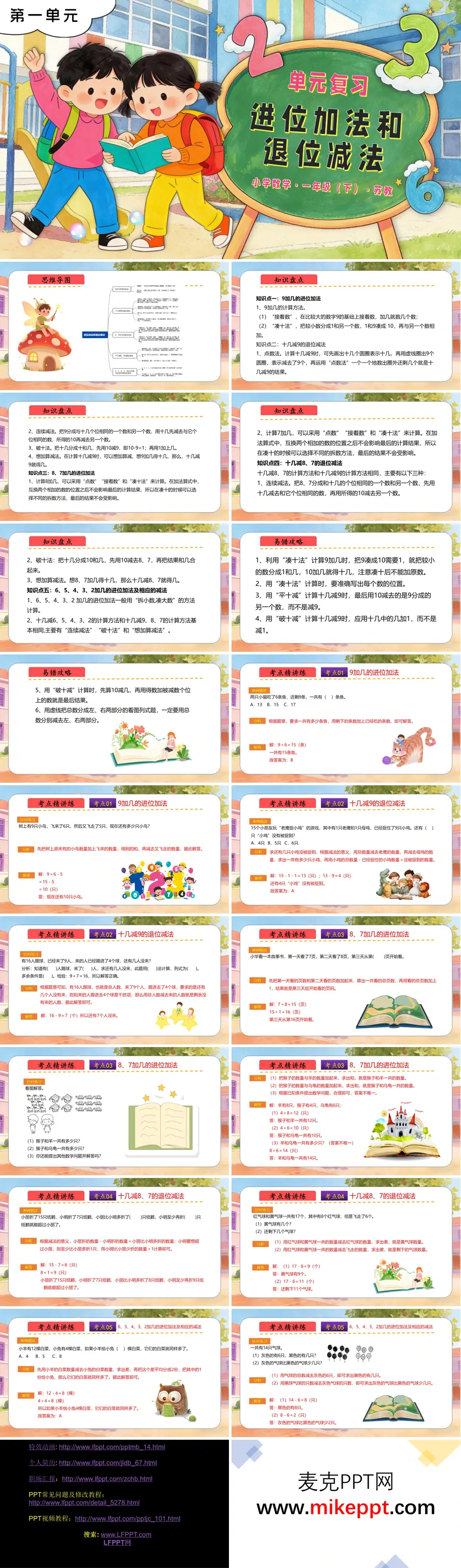 本套 PPT 是苏教版一年级数学下册第一单元“进位加法和退位减法”的单元复习资料,旨在帮助学生系统梳理和巩固本单元的核心内容。 PPT 开篇以思维导图的形式呈现,清晰地勾勒出本单元的知识框架。思维导图涵盖了 9 加几、十几减 9、8/7 加几、十几减 8/7、6-2 加几及对应的减法计算内容。这种结构化的呈现方式帮助学生从整体上把握单元知识体系,为后续的复习提供清晰的思路。 在“知识盘点”部分,PPT 对各知识点的算法进行了详细解读。例如,9 加几采用“凑十法”,十几减 9 使用“破十法”,而 8/7 加几以及后续的加减法则结合平十法、想加算减等多种方法展开。通过分点详解,学生能够清晰地理解每种计算方法的步骤和逻辑,从而更好地掌握进位加法和退位减法的计算技巧。 “易错攻略”模块总结了学生在计算过程中常见的失误,例如在凑十法中误将十位数加上原数,或在破十法中出现数的拆分错误等。通过这些易错点的梳理,PPT 帮助学生在复习中主动规避这些问题,提升计算的准确性和效率。 “考点精练”部分针对本单元的五个核心考点设计了多样化的练习题,包括应用题、选择题等。每个考点都配备了详细的解题思路,明确计算逻辑,帮助学生在实战练习中强化对知识的运用能力。通过这种针对性的练习,学生能够更好地理解和掌握进位加法和退位减法的计算方法。 整套 PPT 设计科学,兼顾了知识梳理、易错提醒与实战练习。它不仅帮助学生系统地回顾和巩固本单元的核心内容,还通过易错点的总结和实战练习,提升了学生的计算能力和问题解决能力,为学生夯实进位加法和退位减法的计算基础提供了有力支持。