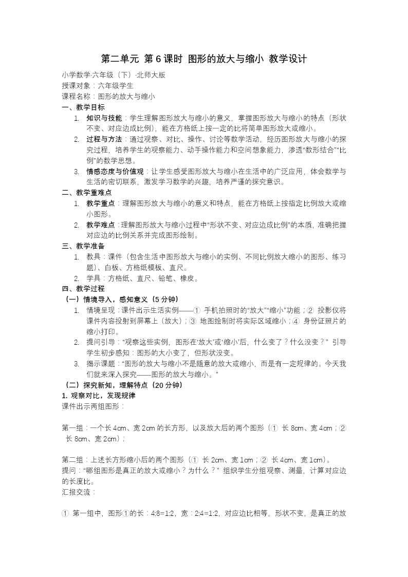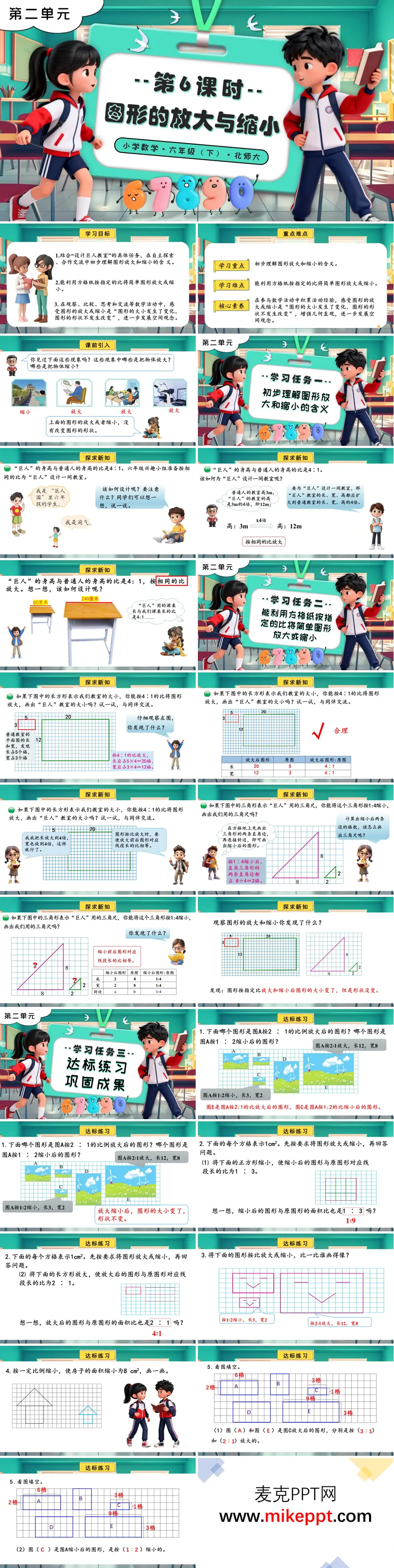 本套 PPT 是为北师大版小学数学六年级下册第二单元第 6 课时 “图形的放大与缩小” 设计的教学资源。它以 “巨人设计教室” 的任务为背景,明确了本课的学习目标:让学生结合具体情境理解图形放大与缩小的含义;能够利用方格纸按照指定的比例对简单图形进行缩放操作;通过观察和实践,感知图形在缩放过程中形状保持不变的特点,从而发展空间观念。本课的重点和难点在于理解图形缩放的含义以及掌握按比例操作的方法。 课前引入环节通过展示生活中常见的放大与缩小现象,如照片放大、投影缩小等,引导学生初步认识到这类变化并不会改变物体的形状,从而自然地引出本课的主题。 在核心教学部分,设置了三个层次分明的学习任务。任务一以 “巨人” 与普通人身高比为 4:1 的情境为切入点,通过生动的情境引导学生初步理解 “按相同比例放大与缩小” 的含义。任务二借助方格纸,直观地演示了如何按照 4:1 的比例放大长方形和缩小三角形的操作方法,重点强调各边需要按照比例进行缩放,帮助学生掌握具体的操作技巧。任务三通过一系列达标练习,包括判断缩放后的图形是否正确、按照指定比例操作图形、分析缩放后图形的周长和面积变化等,进一步巩固学生对图形缩放知识的理解和应用能力。 在课程的最后,通过知识总结环节,梳理了图形缩放的核心要点:图形在缩放过程中形状保持不变,但各边的长度会按照指定的比例发生变化。课后作业则要求学生在生活中选择合适的物体,按照比例进行画图操作,并完成分层作业,旨在帮助学生将课堂所学知识迁移到实际生活中,实现知识的深化与拓展,进一步提升学生的数学应用能力和空间思维能力。