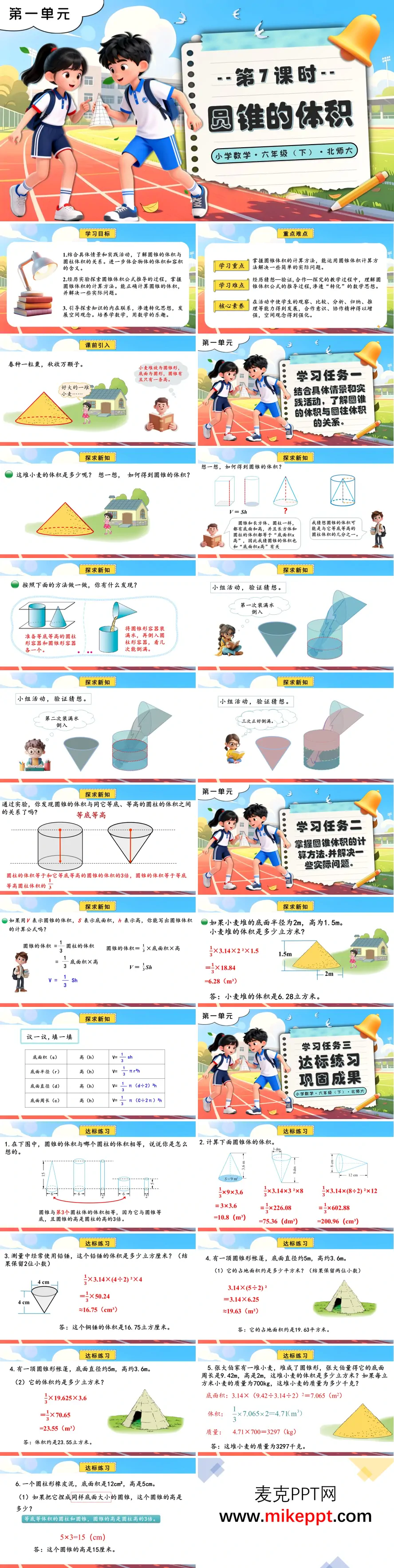 本套 PPT 是为北师大版小学数学六年级下册第一单元第 7 课时 “圆锥的体积” 设计的教学资源。它以小麦堆的情境为背景,明确了本课的学习目标:通过结合实际情境和实验活动,帮助学生理解圆锥与等底等高圆柱的体积关系,推导出圆锥体积公式,并运用公式解决实际问题。同时,本课注重渗透转化思想,培养学生的空间观念。课程的重难点在于让学生掌握圆锥体积的计算方法,并经历“转化”思想的推导过程。 在内容安排上,课前引入环节以小麦堆的体积问题为切入点,自然引出对圆锥体积的探究需求,激发学生的学习兴趣。学习任务一通过等底等高的圆锥和圆柱容器进行装水实验,直观地展示了圆锥体积与等底等高圆柱体积之间的关系,引导学生得出“圆锥体积是等底等高圆柱体积的 3 1 ” 的结论。任务二则进一步推导圆锥体积公式 V= 3 1 Sh ,并拓展到半径、直径、周长等不同条件下的变式公式。同时,结合小麦堆的实际案例,指导学生运用公式进行计算,帮助学生将理论知识应用于实际问题中。任务三通过一系列达标练习,包括体积比较、铅锤、帐篷、粮仓等实际问题,进一步巩固学生对圆锥体积知识的理解和应用能力。 在课程的最后,通过知识总结环节,梳理了圆锥体积公式及其推导过程,帮助学生构建清晰的知识体系。课后作业要求学生动手进行实验,验证圆锥与圆柱体积之间的关系,并完成分层作业。这样的设计旨在通过实践操作和分层练习,帮助学生加深对知识的理解,培养学生的动手能力和数学思维能力,实现知识的巩固与拓展,提升学生解决实际问题的能力。