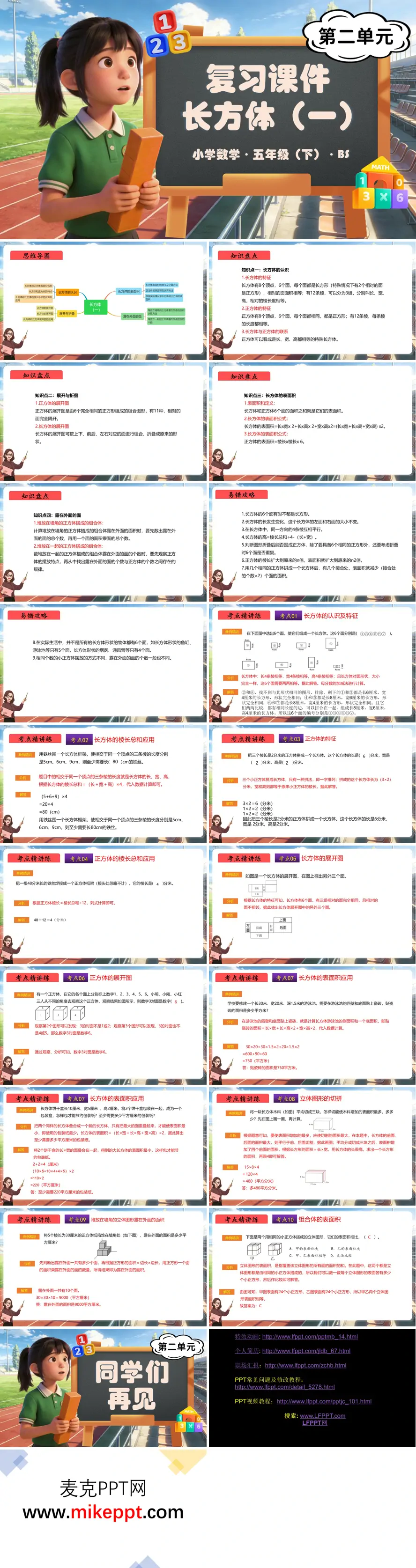 这份“长方体(一)”单元复习课件以“思维导图—知识盘点—易错攻略—考点精讲练”四步递进,将零散知识点织成网、把易错点变成提分点,助力学生从“会算”跃升到“会思、会解”。开篇用一张彩色思维导图总览四大模块:①认识特征②展开与折叠③表面积④露在外面的面,一眼锁定复习范围。 “知识盘点”用对照表细化:长方体6面(相对相等)、12棱(3组)、8顶点,正方体6面全等、12棱全等,展开图11种类型(1-4-1型等),表面积公式(长×宽+长×高+宽×高)×2,露在外面“方向法”前+右+上,逐条配生活实物照片,让抽象概念“有图可依”。 “易错攻略”集中曝光9大陷阱:相对面找错、展开图少算面、表面积单位混淆、露在外重复计数等,用“错题医院”形式呈现,学生用“找茬”方式圈错并口述正解,加深印象。 “考点精讲练”精选10大高频考点:棱长总和求高、展开图能否围成、无盖鱼缸少算上面、切割增加两个面、组合体露面积比较等,每题配“思路导航+规范解答+易错提醒”三栏,动画演示切割、旋转、展开过程,学生先独立试做,再对照讲解,系统即时统计正确率,教师针对“漏算面”“单位不统一”再示范,确保空间观念落地。 总结用“一张思维导图”收束:特征→展开→表面积→露面积,学生用便利贴写下最易错点贴于展板,形成班级“立体警示墙”;自我评价从“我会想面、我会展开、我肯检查”三面点赞,小组互评贴星星,让知识、情感双提升。 整份课件用“导图总览—错因曝光—典例精讲—即时反馈”四连击,把长方体从“六个面”升级成“会辨析、会计算、会优化”的空间模型,既夯实基础,又提升解题策略,为期末综合解决立体几何问题奠定坚实的方法与信心双重基础。
