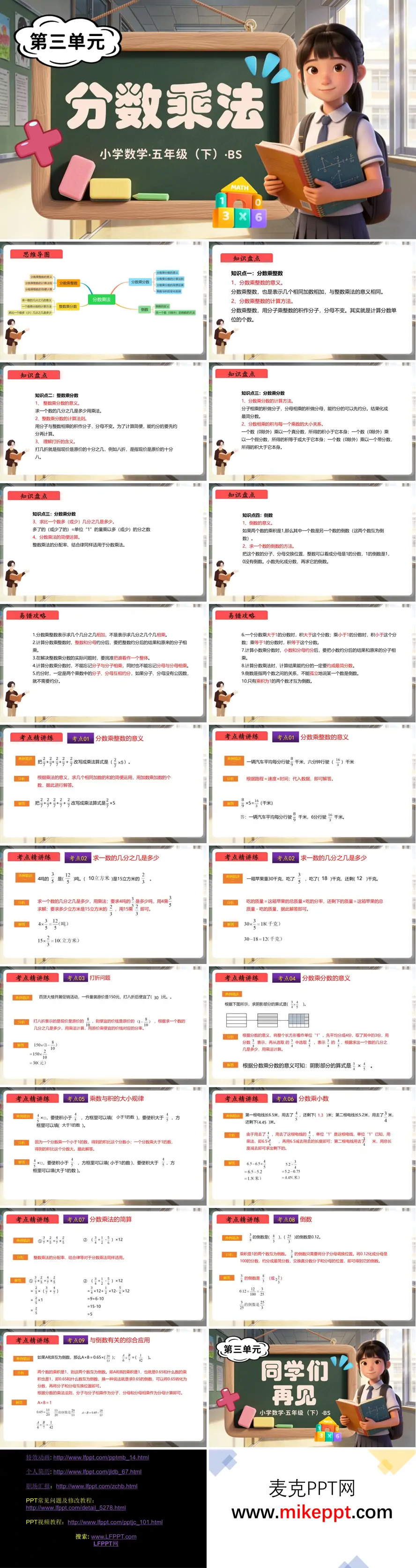 这份五年级下册“分数乘法”单元总结课件以“思维导图—知识梳理—易错警示—考点精练”四步递进,将零散知识点织成网、把易错点变成提分点,助力学生从“会算”跃升到“会思、会解”。开篇用一张彩色思维导图总览四大核心:分数乘整数、整数乘分数、分数乘分数、倒数,旁边点缀“打折、规律、简算”拓展分支,一眼锁定复习范围。 知识梳理用“表格+动画”双通道:分数乘整数突出“求几个相同加数和”,整数乘分数强调“求一个数的几分之几”,分数乘分数用“折纸动画”演示分子相乘、分母相乘,顺势提炼“先约后乘”简算口诀;倒数模块用“翻转动画”呈现分子分母互换,配“积为1”验证,让学生直观看到“倒数即逆”。 易错攻略集中曝光10大陷阱:乘数与积大小关系混淆、约分不彻底、倒数0例外遗漏等,用“错题医院”形式呈现,学生用“找茬”方式圈错并口述正解,加深印象。 考点精讲练精选9大高频题型:基础计算、打折应用、几何面积、体积比例、综合运算等,每题配“思路导航+规范解答+易错提醒”三栏,动画演示“线段图—折纸图—面积图”三种建模过程,学生先独立试做,再对照讲解,系统实时统计正确率,教师针对“单位1找错”“约分漏写”再示范,确保模型落地。 总结用“一张思维导图”收束:意义→法则→规律→应用,学生用便利贴写下最易错点贴于展板,形成班级“分数乘法警示墙”;自我评价从“我会算、我会用、我肯帮”三面点赞,小组互评贴星星,让知识、情感双提升。 整份课件用“导图导航—动画推导—错因找茬—考点精练”四连击,把分数乘法从“算法记忆”升级为“意义理解+模型应用”,既夯实计算技能,又培养数量关系分析能力,为后续分数除法、百分数应用奠定坚实而有趣的基础。
