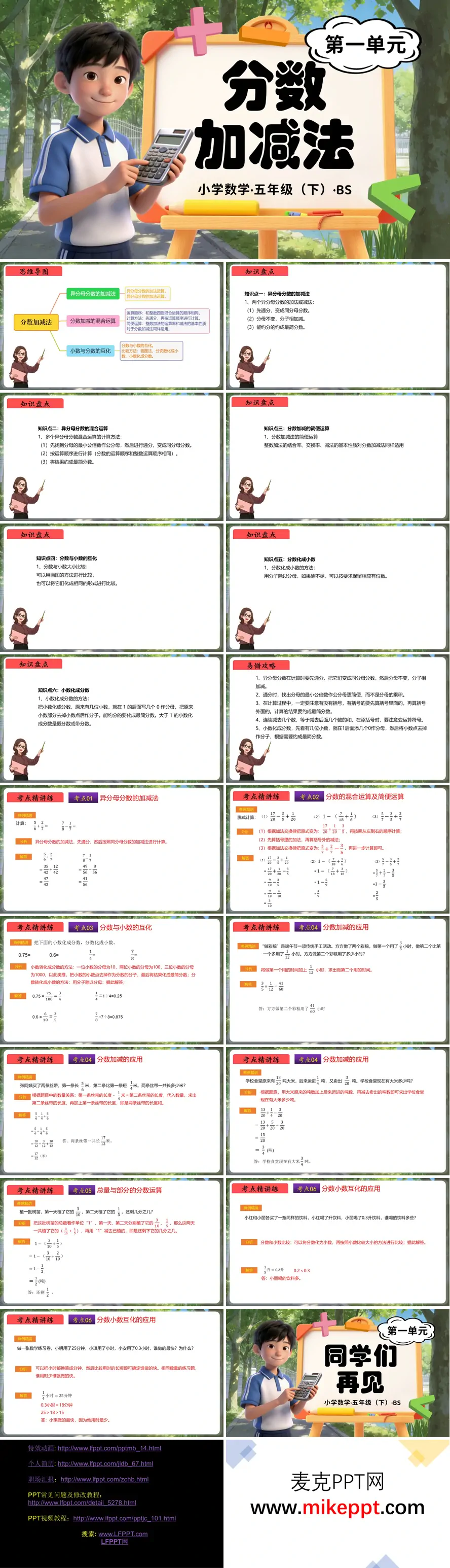 这份五年级下册“分数加减法”单元总结课件以“思维导图—知识梳理—易错警示—考点精练”四步递进,将零散计算要点编织成网,助力学生从“会算”跃升到“会辨、会优、会用”。开篇用一张彩色思维导图总览六大核心:异分母加减、混合运算、简便运算、分数小数互化、大小比较、实际问题,一眼锁定复习范围。 知识梳理用“表格+口诀”双通道:异分母突出“先通分再加减,最小公倍最简便”;混合运算强调“有括号先括号,无括号从左到右”;简便运算用“凑整法”把同分母先合并;互化部分用“除法搬家”口诀:分数→小数用分子÷分母,小数→分数看位数写10、100再约分;大小比较用“同分母、同小数、交叉相乘”三策略,配“喝牛奶剩多少”生活例题,让计算规则看得见、用得上。 易错攻略集中曝光5大陷阱:通分不彻底、混合运算顺序错、凑整后忘减剩余、除不尽四舍五入错、单位“1”找错,用“错题医院”形式呈现,学生用“找茬”方式圈错并口述正解,加深印象。 考点精讲练精选6大高频题型:基础通分、混合运算、简便凑整、互化比较、折线统计图补数据、溶液混合问题,每题配“思路导航+规范解答+易错提醒”三栏,动画演示“线段图—通分过程—凑整步骤”,学生先独立试做,再对照讲解,系统实时统计正确率,教师针对“凑整后漏减”“通分母写错”再示范,确保算理清晰。 总结用“一张思维导图”收束:通分→顺序→凑整→互化→比较→应用,学生用便利贴写下自己最易错点贴于展板,形成班级“加减法警示墙”;自我评价从“我会算、我会用、我肯帮”三面点赞,小组互评贴星星,让知识、情感双提升。 整份课件用“导图导航—口诀速记—错因找茬—考点精练”四连击,把分数加减法从“机械计算”升级为“会通分、会简算、会转化”的综合技能,既突破“计算准确率”难点,又培养数量关系分析能力,为期末综合解决应用题奠定坚实而有趣的基础。