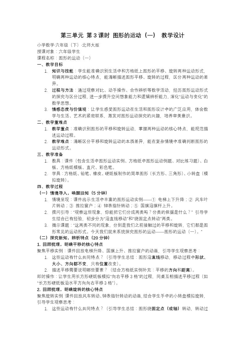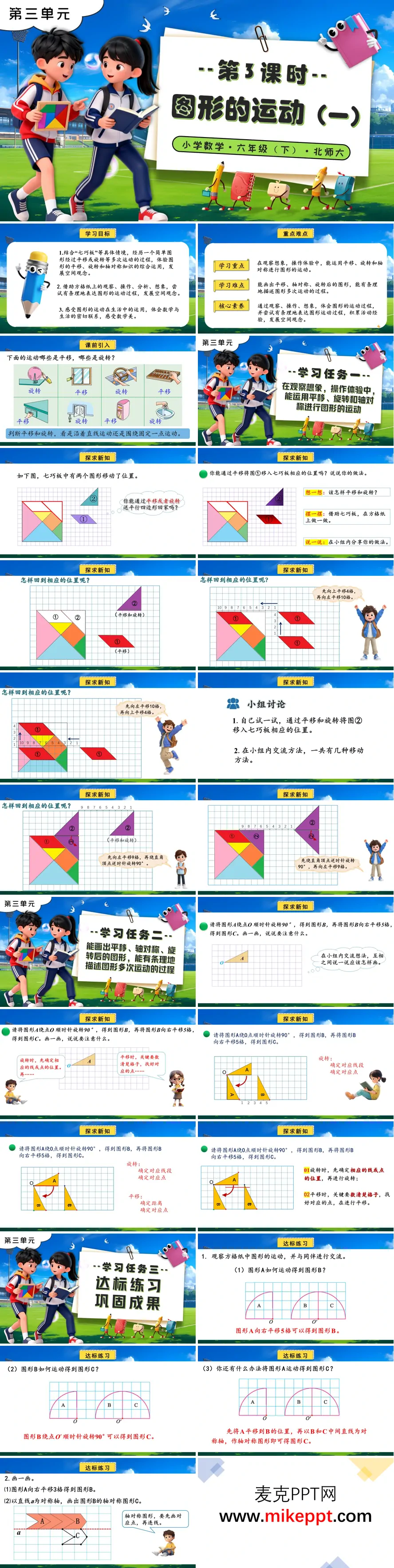 本节课是北师大版六年级下册第三单元第 3 课时 “图形的运动(一)”,旨在帮助学生体会平移、旋转和轴对称的综合运用,能够梳理图形的运动过程并进行画图,从而发展空间观念。 PPT以“区分生活中的平移与旋转”为引入点,通过生动的生活实例,引导学生明确平移和旋转这两种运动方式的特点,为后续学习奠定基础。学习任务一围绕七巧板图形归位展开,通过引导学生运用“平移 + 旋转”的组合操作,探索图形回归原位的多种方法,例如“先平移再旋转”或“先旋转再平移”。这一过程不仅让学生体会到图形运动的灵活性,还培养了他们从不同角度思考问题的能力。 学习任务二聚焦于“画图形多次运动后的形状”,以三角形为例,详细分解了运动过程中的关键步骤:先进行旋转(确定关键点),再进行平移(找准方向和距离)。通过梳理运动过程的描述逻辑,学生能够清晰地表达和理解图形的运动轨迹,进一步提升空间思维能力。 在后续的达标练习环节,设计了涵盖图形运动方式的判断、组合运动的画图以及图案运动的分析等多种题型。这些练习旨在通过多样化的任务,强化学生对平移、旋转和轴对称的综合运用能力,帮助他们在不同情境中灵活应用所学知识。 最后,通过知识总结,梳理了图形运动的分析要点,帮助学生对本节课的重点内容进行系统回顾。搭配课后实践作业,进一步巩固学生对图形运动的理解和操作技能,使他们在实践中更好地掌握平移、旋转和轴对称的综合运用,从而提升空间观念和综合应用能力。