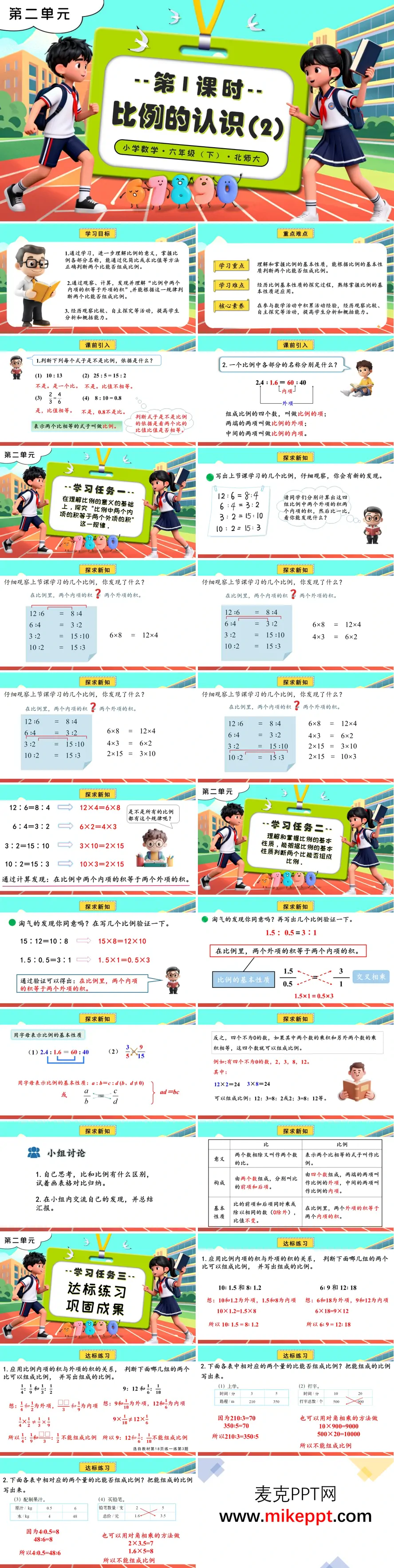 本节课是北师大版六年级下册第二单元第 1 课时 “比例的认识(2)”,其核心目标是让学生掌握比例的基本性质,并能够根据这一性质判断两个比能否组成比例,从而提升学生的分析与探究能力。 PPT以复习“比例的判断方法”和“比例各部分名称”为开场,帮助学生回顾已学知识,为深入学习比例的基本性质做好铺垫。在学习任务一中,通过引导学生观察已学的比例,发现“内项积等于外项积”的规律。经过对多个比例的验证,学生总结出比例的基本性质,并通过字母规范表达:若 a:b=c:d ,则 ad=bc 。此外,本环节还通过表格对比“比”与“比例”的定义、构成及性质,帮助学生明确二者的区别,进一步加深对比例概念的理解。 学习任务二聚焦于比例基本性质的应用,引导学生学习如何通过“内项积与外项积是否相等”来判断两个比能否组成比例。这一过程不仅巩固了比例的基本性质,还培养了学生运用性质解决实际问题的能力。 在后续的达标练习环节,设计了涵盖比例判断、表格中量的比例分析、根据乘法算式写比例、填比例未知数等多种题型。这些练习旨在通过多样化的任务,帮助学生进一步强化对比例基本性质的理解和应用能力,提升他们的数学思维和解题技巧。 最后,通过知识总结,梳理了比例的基本性质,使学生对本节课的核心内容有更清晰的认识。搭配课后实践作业,进一步巩固学生对比例性质的理解和应用能力,帮助他们在实践中提升分析与探究能力,为后续学习比例相关知识奠定坚实基础。