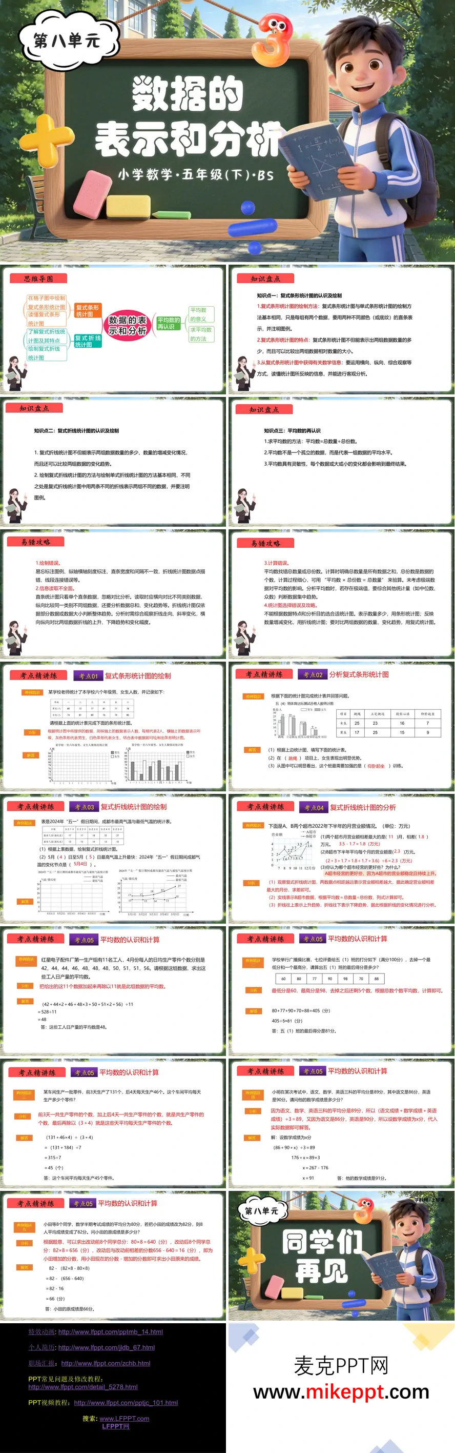 这份五年级下册“数据的表示和分析”单元复习课件以“思维导图—知识盘点—易错攻略—考点精讲练”四步递进,把复式条形图、复式折线图和平均数三大板块串成一条清晰的“数据链”,帮助学生从“会画图”升级为“会读、会比、会解释”。开篇用一张彩色思维导图总览:条形图比多少、折线图看变化、平均数代表总体——一目了然锁定复习范围。 知识盘点用“表格+关键词”速记:条形图强调“不同颜色+图例+同一刻度”,折线图突出“点线色+变化趋势”,平均数总结“代表水平+灵敏+简单”,每条配生活实例图标,让抽象概念“有图可依”。 易错攻略集中曝光5大高频失误:绘图忘标题、刻度不均、图例缺失、折线连错点、平均数受极端值误导,用“错题医院”形式呈现,学生用“找茬”方式圈错并口述改正,加深印象。 考点精讲练精选5大核心情境:学校男女生人数双图对比、超市营业额变化趋势分析、工人日产量平均数计算、阅读时间差异解释、运动会成绩预测,每题配“绘图—读数—比较—预测”四步示范,动画演示“描点—连线—标注”全过程,学生先独立试做,再对照讲解,系统实时统计正确率,教师针对“趋势描述不准”“平均数代表性质理解偏差”再点评,确保“会画、会看、会说”全程过关。 总结用“一张思维导图”收束:条形比多少,折线看变化,平均代表总体,学生用便利贴写下自己最易错环节贴于展板,形成班级“数据警示墙”;自我评价从“我会画、我会看、我肯分析”三面点赞,小组互评贴星星,让知识、情感双提升。 整份课件用“导图总览—错因曝光—典例精讲—即时反馈”四连击,把统计图从“会画”升级为“会读趋势、会比差异、会作预测”,既培养数据整理与描述能力,又渗透统计观念和决策意识,为期末综合解决图表类题目奠定坚实的方法与信心双重基础。
