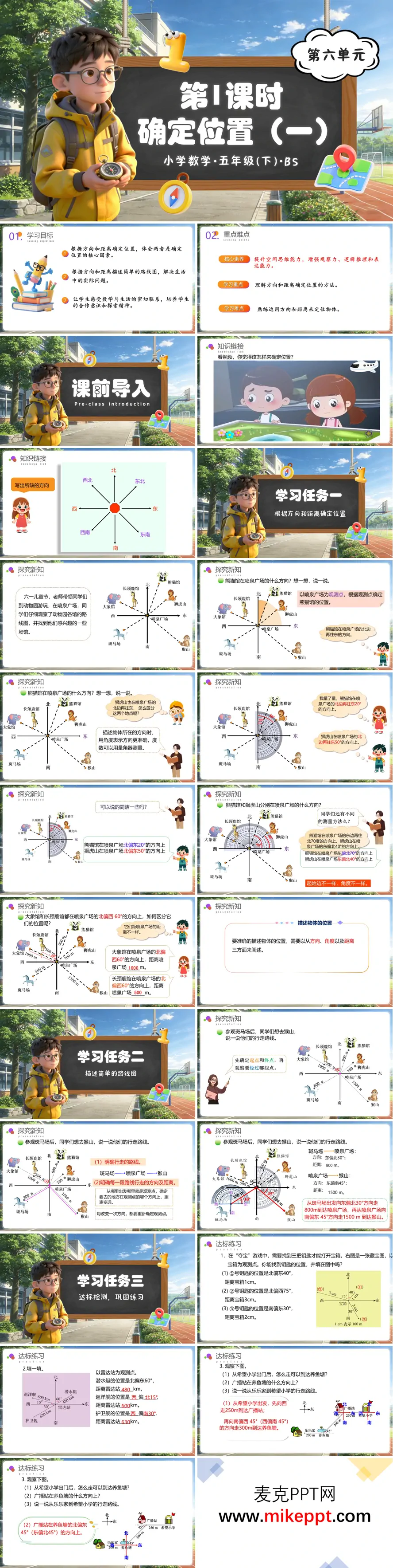 这份五年级下册“确定位置(一)”课件以“方向+角度+距离”为核心,借助动物园实景和藏宝图、雷达站等生活化任务,引导学生在“找位置—说路线—换观测点”的连续体验中,建立精准的空间描述习惯。开篇用“知识快闪”唤醒八个基本方向,随后播放“动物园游玩”短片:喷泉广场为起点,熊猫馆和狮虎山都在“北偏东”区域,学生发现仅凭方向无法区分,教师顺势引入“角度”——用量角器在平面图上标出20°与50°,让学生看到“北偏东20°”与“北偏东50°”的不同,明确“方向需角度细化”。 接着呈现同方向的大象馆和长颈鹿馆:北偏东30°,一个距离300 m,一个600 m,学生再次体会“距离是定位第二钥匙”,从而归纳出“方向+角度+距离”三步定位法,并用“观测点不变,方向角距离齐全”口诀强化记忆。 路线图部分用“动态脚印”演示:从喷泉广场出发,先向北偏东30°走300 m到大象馆,再向南偏东45°走200 m到长颈鹿馆,观测点随行走变化,脚印箭头同步更新,学生直观感受“描述路线=连续定位”,并学会“每段都以当前位置为新观测点”。 达标训练六道题情境丰富:藏宝图钥匙定位、雷达站观测舰艇、校园周边路线规划、期末真题“书店—邮局—家”描述等,均选自多地期末卷,学生先独立用量角器、刻度尺在平面图作业,再小组互评“角度误差、距离比例”,系统实时统计正确率,教师针对“观测点写错”“角度方向混淆”再示范,确保“会定位、会描述”全程过关。 总结用“一张思维导图”收束:方向→角度→距离→路线→观测点变化,学生用便利贴写下最易错点贴于展板,形成班级“定位警示墙”;自我评价从“我会量角、我会描述、我肯检查”三面点赞,小组互评贴星星,让知识、情感双提升。 整份课件用“视频激趣—角度细化—距离锁定—路线更新”四连击,把“确定位置”从“大概知道”升级为“会用量角器、会写三要素、会换观测点”的空间技能,既培养几何直观,又渗透连续描述思想,为后续学习坐标、比例尺奠定坚实而有趣的基础。
