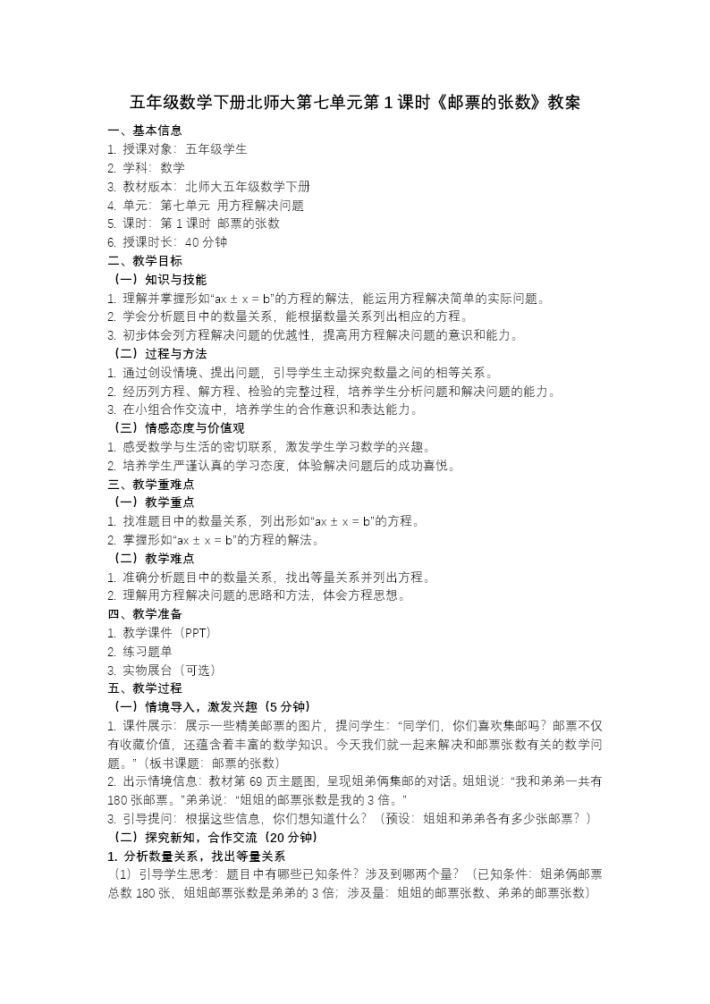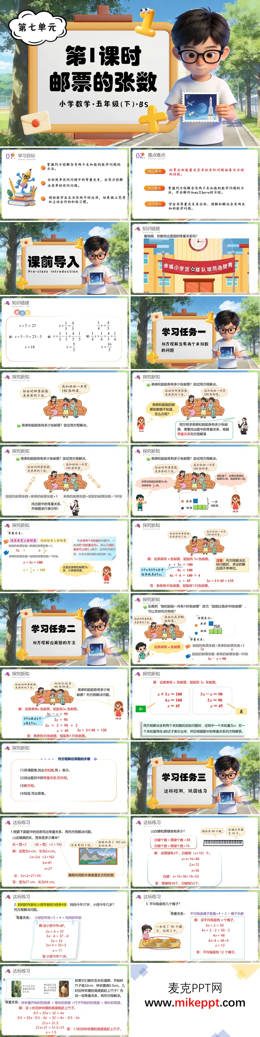 这份“邮票的张数”课件以“姐弟集邮”为主线,通过“情境设疑—找等量—列方程—变式巩固”四步,引导学生掌握“含两个未知数”的方程建模与求解策略,培养抽象思维与代数表达能力。开篇用“解方程热身”快闪:2x+3x=25,激活合并同类项旧知;随即抛出生活情境——“姐弟共有180张邮票,姐姐是弟弟的3倍”,学生尝试用算术解,发现“两个未知数无法一步算”,教师顺势点明“方程优势”。 探究环节用“线段图+代数式”双通道:先画弟弟1段、姐姐3段,共4段对应180张,学生口答“4x=180”,教师示范“设1倍量为x,用3x表示另一个未知数”,板书规范解方程过程,强调“ax+bx=c”合并同类项的算法;随即条件改为“姐姐比弟弟多90张”,线段图变为“姐姐3段-弟弟1段=2段=90张”,学生类比列出3x-x=90,巩固“设倍量、列差式”的建模思路,并总结“找倍—设x—列方程—检验”四步解题法。 达标训练六道题层层递进:①长方形长是宽的2倍,已知周长求长宽;②钢琴白键比黑键多16个,总数已知求各键数;③年龄差问题含“几年后”变式,均选自多地期末真题,学生先独立画线段图找等量,再小组互评“设未知数是否合理”,系统实时统计正确率,教师针对“设倍量错误”“等量关系写反”再示范,确保“会找倍、会设x、会解方程”全程过关。 总结用“一张思维导图”收束:找倍—设x—列方程—检验,学生用便利贴写下最易错点贴于展板,形成班级“方程警示墙”;自我评价从“我敢设x、我会找倍、我肯检验”三面点赞,小组互评贴星星,让知识、情感双提升。 整份课件用“情境设疑—线段建模—变式巩固—真题应用”四连击,把“两个未知数”从“算术困难”升级为“方程优势”的代数思维,既突破“找等量关系”难点,又培养建模与代数表达能力,为后续学习更复杂方程及函数思想奠定坚实而有趣的基础。