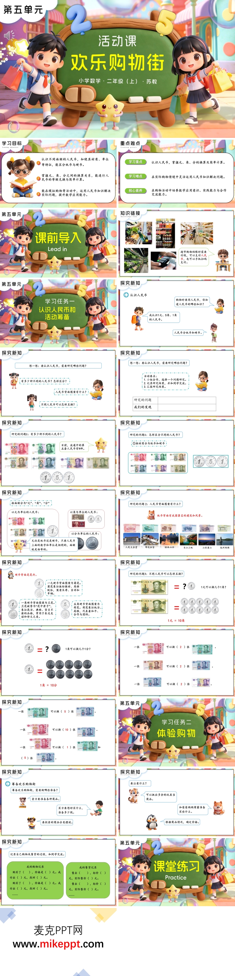 本套 PPT 是为苏教版二年级上册数学第五单元精心打造的活动课课件,以“欢乐购物街”为主题,借助趣味化的购物场景来串联教学内容,充分契合低年级学生的认知特点。课件紧密围绕“人民币的认知与实际应用”展开,旨在引导学生认识人民币纸币和硬币的面值,包括元、角、分,并熟练掌握元角分之间的换算规则,例如 1 元 = 10 角。同时,通过一系列教学活动,帮助学生学会在购物过程中的计算与实操技巧。 课件内容主要分为两大学习任务。第一部分是“认识人民币和活动筹备”,通过“凑指定金额”“币值兑换”等互动任务,让学生在动手操作中熟悉不同面值人民币的组合方式以及换算方法,从而加深对人民币的认知。第二部分是“体验购物”,通过模拟真实的购物场景,引导学生计算商品的总价,练习付账与找零,解决诸如“最优付款方式”等实际生活问题,让学生在模拟购物的过程中将所学知识运用到实践中,提高解决实际问题的能力。 此外,课件还设置了专门的课堂练习板块,配备了一系列与换算、购物实操相关的习题,帮助学生巩固本节课所学的知识点。整体而言,课件以卡通形象和场景化设计营造出轻松愉悦的学习氛围,将数学知识与生活实践紧密结合起来,让学生在趣味十足的活动中逐步掌握人民币的认知与使用技能,激发学生对数学学习的兴趣,培养他们的实践能力和数学思维。