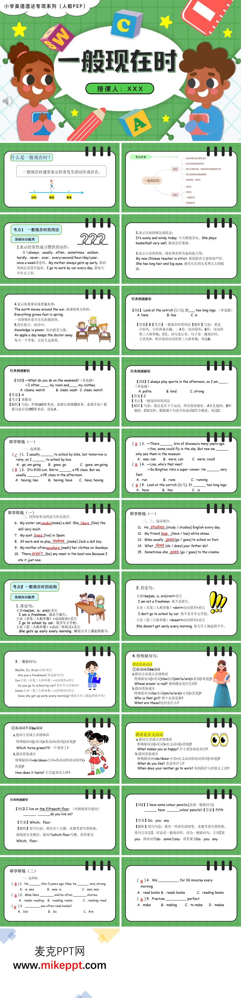 这是一套专为人教版 PEP 小学英语精心设计的“一般现在时”语法专项课件,旨在围绕小学阶段的核心语法知识展开教学,其结构清晰且充分考虑了小学生的认知特点,能够帮助学生高效掌握这一重要语法点。 课件从“什么是一般现在时”入手,通过简洁明了的讲解,让学生明确一般现在时用于表示经常发生的动作或存在的状态,并结合常见的如“often”“usually”等时间标志词的示例,帮助学生快速理解其基本概念,为后续学习奠定基础。 在核心内容部分,课件分为两大考点进行详细讲解。考点一聚焦于一般现在时的常见用法,涵盖习惯性动作、客观事实等典型场景,并标注了“often”“sometimes”等常用时间标志词,同时搭配经典例题进行详细解析,帮助学生在具体语境中理解语法知识。考点二则深入拆解了一般现在时的句式结构,从肯定句(不同人称下动词形式的变化)、否定句(“don’t”“doesn’t”等助动词的运用)、一般疑问句到特殊疑问句,逐一详细讲解其语法规则,并通过句式转换的实操示例,让学生在实践中加深对语法结构的理解和运用。 为巩固学生对知识点的掌握,课件还配套了单选、动词形式填空、句型转换等多种题型的学习训练,全面覆盖了不同难度层次,帮助学生在多样化的练习中熟练运用所学语法知识。最后,课件补充了句型转换技巧等专项总结,进一步强化了知识的系统性,帮助学生构建完整的语法知识体系。 整体而言,这套课件在设计上融入了丰富的卡通元素,以生动有趣的画面吸引学生的注意力,同时采用讲练结合的方式,既清晰地传递了语法规则,又通过大量的例题和练习帮助学生将知识落地运用,真正实现了知识传授与能力培养的有机结合,是一套适合小学阶段语法教学的优质课件。