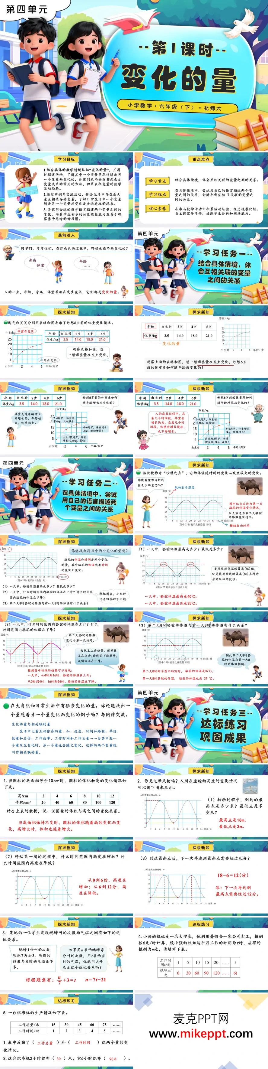这是一套北师大版六年级下册数学第四单元第 1 课时“变化的量”的教学课件,专注于引导学生认识相关联的变量关系,帮助他们理解生活中变量之间的动态联系。 课件的学习目标是让学生结合具体情境,认识“变化的量”,理解一个量随另一个量变化的关联性,并通过表格、图表等形式表示变量关系。同时,学生将体会生活中变量的普遍存在,从而发展数据分析与表达能力。本课的重点和难点在于帮助学生体会变量间的关系,并能用自己的语言描述变化规律。 在课前引入环节,课件以“成长中变化的量(身高、体重)”为例,贴近学生生活,激发他们的学习兴趣。核心学习任务分为三部分:第一部分结合妙妙 6 岁前体重随年龄变化的表格和图表,引导学生观察并体会相关联变量的变化关系,初步感受一个量随另一个量变化的规律;第二部分通过骆驼体温随时间变化的折线图,进一步引导学生用语言描述两个变量的变化规律,例如体温的升降时段,帮助学生深入理解变量之间的动态关联;第三部分是达标练习,通过圆柱体积与高、摩天轮高度与时间等生活化案例,强化学生对变量关系的分析能力,巩固所学知识。 课件采用表格、折线图等直观形式呈现变量,案例选择贴合学生生活实际,如体温变化、摩天轮运动等,帮助学生更好地理解“一个量随另一个量变化”的内涵。结尾部分,课件总结了图表分析变量的步骤,为学生提供了清晰的学习方法。课后作业则要求学生寻找生活中的变量关系,鼓励他们将所学知识应用于实际生活中,进一步拓展思维。 整体而言,这套课件设计科学合理,通过丰富的生活化案例和直观的图表呈现,帮助学生逐步理解变量之间的关系,培养了学生的数据分析能力和语言表达能力,是一套适合六年级学生学习“变化的量”的优质教学资源。