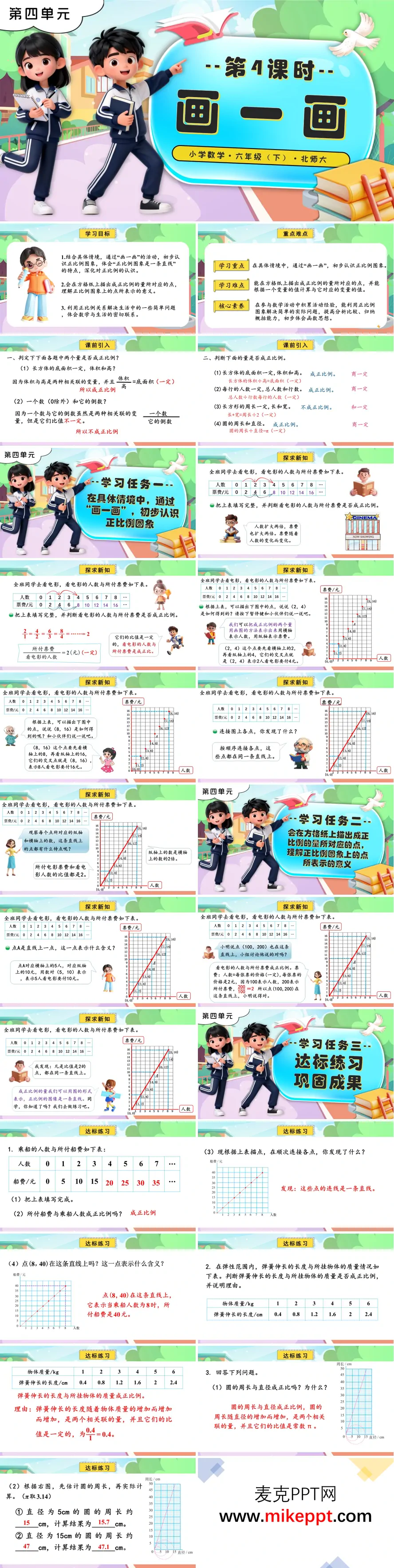 这是一套北师大版六年级下册数学第四单元第 4 课时“画一画”的教学课件,旨在帮助学生进一步深化对正比例概念的理解,聚焦于正比例图象的认识与应用,使其能够将抽象的正比例关系具象化为直观的图象形式。 课件的学习目标是通过看电影人数与票费等具体情境,引导学生通过“画一画”的方式初步认识正比例图象,并发现其为一条直线。学生需要学会在方格纸上描出正比例量的对应点,理解图象上点的意义,并能利用图象解决简单的实际问题。本课的重难点在于让学生掌握正比例图象的绘制方法,并深刻理解图象与数量关系之间的对应性。 课件以“判断成正比例的量”作为课前复习引入,帮助学生回顾正比例的基本概念,为后续学习做好铺垫。核心学习任务分为三个部分:第一部分通过“看电影人数 - 票费”表格,引导学生先判断人数与票费是否成正比例,然后在方格纸上描点并连线,发现正比例图象是一条直线,从而初步感知正比例图象的特征。第二部分深入解析图象上点的含义,例如某个点对应的具体人数与票费,帮助学生理解图象上每一个点都代表一组具体的数据关系。第三部分是达标练习,通过乘船费用、弹簧伸长、圆周长等实际案例,巩固学生描点、判断成正比例以及利用图象解题的能力,进一步强化学生对正比例图象的理解和应用。 在课程结尾,课件总结了正比例图象的特征与绘制步骤,帮助学生梳理本节课的重点知识。课后作业则要求学生绘制生活中正比例量的图象,鼓励他们将所学知识应用于实际生活,进一步拓展对正比例图象的理解和应用能力。 整体而言,这套课件设计科学合理,通过具体的生活情境和直观的图象绘制过程,引导学生从抽象的正比例概念过渡到直观的图象表达,帮助学生在实践中掌握正比例图象的特征和绘制方法。从课前复习到核心任务的逐步推进,再到巩固练习和课后拓展,课件充分体现了以学生为中心的教学理念,有助于学生在探究中掌握知识,提升数学思维和实践能力。