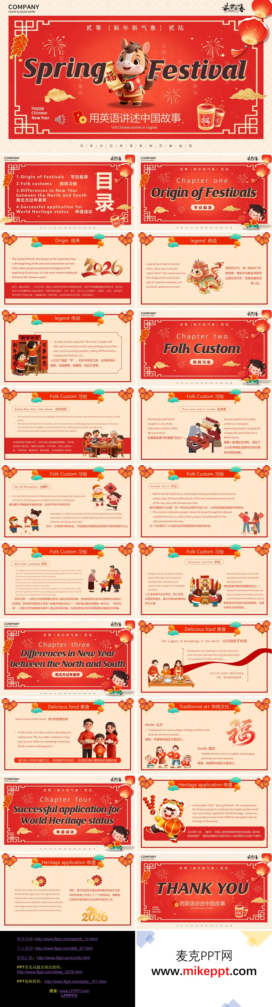 这是一套以"用英语讲述中国故事"为主题的春节文化PPT,采用中英双语对照形式,系统介绍中国传统佳节。内容分为四大板块:**节日起源**讲述春节由上古祈年祭祀演变而来,并融入"年兽"驱邪传说;**民间习俗**详述年夜饭、贴春联、放爆竹、扫尘、拜年、祭祖六大传统,强调团圆祈福的文化内涵;**南北差异**对比饮食与艺术差异——北方吃饺子、剪纸年画,南方品年糕汤圆、春联挂画;**申遗成果**突出2024年12月春节成功列入联合国教科文组织人类非物质文化遗产代表作名录的意义。整体设计融入"福"字、生肖等传统元素,既适合文化传播,也便于国际交流,是一套兼具知识性与观赏性的文化展示材料。