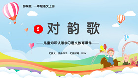 今天,我们来学一首儿歌《对韵歌》。无论单字对还是双字对,它们字数相等,读起来朗朗上口,这就是韵文。把对应的事物名称读得略重一点儿,对字轻读。通过读,我们发现,对韵歌读起来可以快,可以慢,可以重,也可以