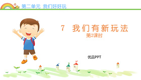 活动一:玩出新花样。传统游戏换个玩法,可以变成新游戏;简单玩具变个花样,可以玩出更多乐趣!跳绳还可以有什么新玩法呢?变个规则玩一玩,游戏会有新乐趣。我们一起来试试新玩具和新玩法吧!活动二:一起来创造。
